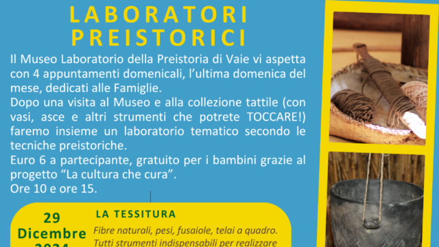 Vi aspettiamo al Museo Laboratorio della Preistoria di Vaie (TO) con 4 appuntamenti domenicali, l’ultima domenica del mese, dedicati alle Famiglie. Dopo una visita al Museo e alla collezione tattile (con vasi, asce e altri strumenti che potrete TOCCARE!) faremo insieme un laboratorio tematico secondo le tecniche preistoriche. Euro 6 a partecipante, gratuito per i… Leggi tutto